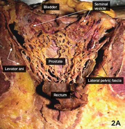 In simple schematics of radical prostatectomy, the NVB is usually depicted as a “cable strand.” In reality, the NVB is an extremely complex network of small and tiny vessels and nerves in and on the prostate – and thus cannot be preserved during radical surgery. Figure 2A shows an anatomical preparation of the neurovascular network, also called “Aphrodite’s veil” because of its fine and diffuse structure. Figure 2B shows on a schematic cross-section through the prostate the different parts of the NVB and its course up and inside the prostate capsule.