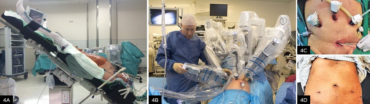 To allow unobstructed access for the robotic arms to the prostate, the contents of the abdomen, primarily the small and large intestines, must be removed from the access path. This is done in Da Vinci surgery by turning the patient upside down. In this so-called “Trendelenburg” positioning, the patient and the operating table are brought to a head-down position of 45° (see Figure 4A). This is a considerable burden, especially for old, overweight and sick patients, in addition to the anesthesia, with an operation duration of 2 to 4 hours (without complications).