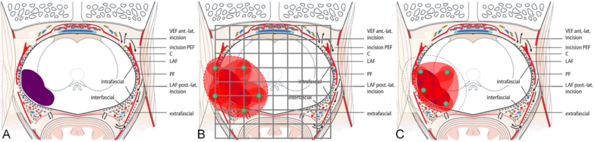 Figure 9B shows the superimposition of a standard brachytherapy grid with 5 mm hole spacing over the prostate. According to the technique recommended by the manufacturer Angiodynamics, the electrodes (green dots) should be placed so that the tumor is surrounded by electrodes. The localization of the electrodes results from the nearest grid points, respectively holes in the grid. The figure shows the IRE ablation fields resulting from an application using Grid.