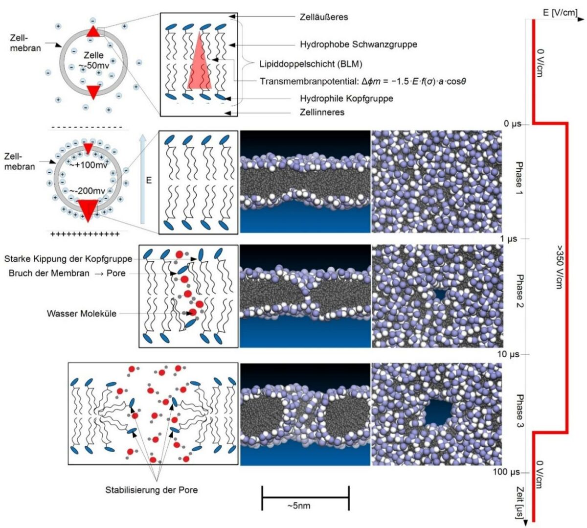 Setzt man Zellen starken elektrischen Feldern aus, bilden sich Poren (kleine Löcher in der Zellmembran), die die Zellmembran durchlöchern (Abbildung 3 und 4). Bei einer Irreversiblen Elektroporation schließen sich diese Poren nicht wieder. Dadurch wird die Zelle dysfunktional, wodurch sie die sogenannte Apoptose auslöst, einen „Selbstmordmechanismus“ der Zelle. Auch Nekrosemechanismen sind am Zelltod durch Irreversible Elektroporation beteiligt (siehe Abbildung 5).